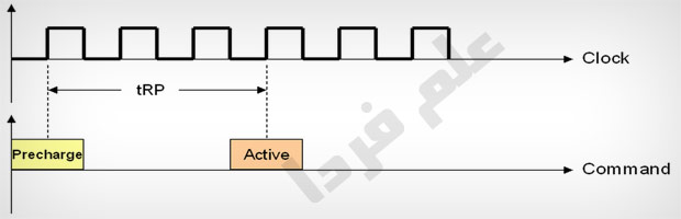 خب در قسمت بالایی گفتم که یه سطر فعال میشه بعدش ستون فعال میشه تا یه خونه مشخصی از رم در اختیار قرار بگیره . حالا اگه یه خونه دیگه از رم فراخونی بشه که در یک سطر دیگه باشه ، اون سطر قبلی باید غیر فعال بشه و اون سطر جدید فعال . واسه همین یه سیگنال با عنوان Precharge به سطر اعمال میشه تا غیرفعال بشه و دستور Active مجددا به خونه بعدی اعمال بشه . مدت زمان بین دستور Precharge و Active رو tRP میگن .