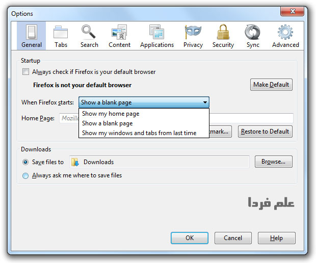 اگرShow my Home page رو روی Show my windows and tabs from last time تنظیم کنید . هر بار که برنامه فایرفاکس رو باز می کنید پنجره ها و تب هایی که آخرین بار باز کرده بودین ، نمایش داده میشن . این گزینه برای افرادی مناسبه که خیلی وقتا مجبور میشن مروگر شون رو ببندن و بعدا که مراجعه می کنن کار شون رو ادامه بدن .