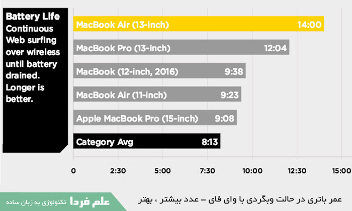 عمر باتری لپ تاپ یکی از مهمترین مسائلی هست که موقع خرید لپ تاپ باید بهش توجه کنید . مک بوک ایر 13 اینچی ، بهترین آلترابوک از نظر عمر باتری در لپ تاپ های اپل هستش . مک بوک ایر 13 اینچی ، در حالت وبگردی با وای فای ، حدود 14 ساعت می تونه روشن بمونه . بعد از اون ، مک بوک پرو 13 اینچی تو حالت وبگردی با وای فای می تونه 12 ساعت روشن باشه و بعد از اون ، مک بوک 12 اینچی با همین شرایط می تونه تا 9 ساعت و 38 دقیقه روشن بمونه . مک بوک پرو 15 اینچی هم با همین شرایط تا 9 ساعت دوام میاره .