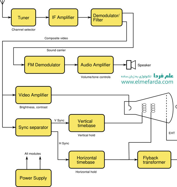 همین تلویزیون های CRT یا لامپی ها نمونه های بارزی از تلویزیون آنالوگ هستن . تلویزیون آنالوگ بر اساس سیگنال آنالوگ کار میکنه یعنی صوت و تصویر روی یه موج RF مدوله ( سوار ) میشن و توسط آنتن هوایی دریافت میشن . این سیگنال از طریق سیم آنتن وارد تیونر تلویزیون میشه ، اونجا به دو بخش صوت و تصویر تقسیم میشه که صدا میره به پردازنده صوتی یا آمپلی فایر و تصویر هم به پردازش گر های تصویر . صدا از بلندگو درمیاد و تصویر هم به لامپ تصویر میره تا شما تماشا کنید .