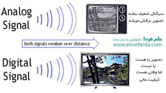 تلویزیون آنالوگ برفکی میشه چون سیگنال آنالوگ نویز میگیره ، در و دیوار و آهن و آهن ربا و هر فلزی می تونه روی اون تاثیر بذاره ، مسافت می تونه کیفیتش رو پایین بیاره . از طرف دیگه موقع دریافت هم باید به خوبی روی یه فرکانس خاصی تلویزیون رو تنظیم کنید و با این حال بازم اون چیزی نمیشه که باید بشه .