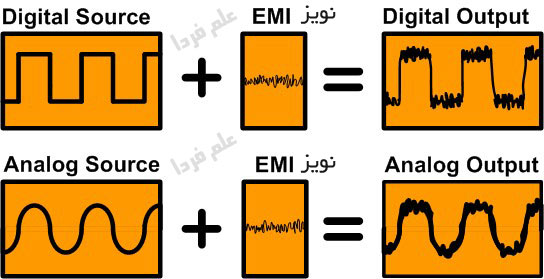مثلا در تصویر بالا می بینید که نویز EMI یا تداخل الکترومغناطیسی چگونه روی سیگنال دیجیتال و آنالوگ تاثیر میذاره . سیگنال دیجیتالی که ۵ ولت هست با نویز مثلا میشه ۴.۵ ولت ، اما بازم ۵ ولت حساب میشه ( یکِ منطقی ) اما در مورد آنالوگ اینجوری نیست ، کوچکترین تغییر می تونه مشکل ساز بشه چون هر لحظه از موج آنالوگ معنی خاصی میده .