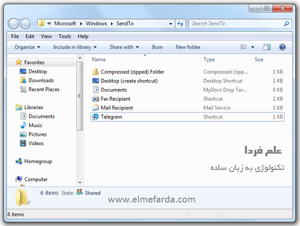 اضافه کردن تلگرام به منیوی Send to ویندوز از طریق پوشه Send to