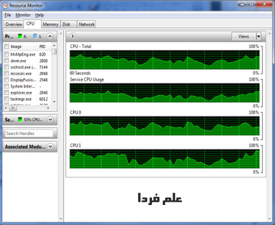 اگه الان تسک منیجر رو باز کنید و گراف هسته های پردازنده تون رو نگاه کنید تقریبا شبیه به هم هستن . حالا من برای امتحان ، دو تا نرم افزار رو با دو هسته پردازشی مجزا اجرا می کنم تا ببینیم چی میشه . نرم افزار Microsoft Security Essentials رو روی یه هسته و نرم افزار Disk Defragmenter رو با یه هسته دیگه اجرا میکنم . حالا برنامه داخلی Resource Monitor رو باز میکنم تا تاثیر تنظیم هسته پردازنده رو بهتر ببینیم . منیوی استارت و در قسمت سرچ بنویسید Resource monitor و بازش کنید . پنجره ای مثل شکل زیر باید ببینید :