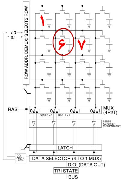 در تصویر زیر نحوه اتصال خازن و ترانزیستور رو می بینید که با همدیگه تشکیل یک سلول حافظه رو میدن . از کنار هم گذاشتن این سلول ها به سطر و ستون های زیادی می رسیم . هر کدوم از این سلول ها توسط یک سطر و یک ستون آدرس پذیر میشن . یعنی مثلا اگه بخوایم به سلول 6 که در تصویر مشخص کردم، آدرس بدیم و کنترلش کنیم باید خط آدرس های متصل به سطر 2 و ستون 2 فعال بشن و یا اگه سلول 7 رو بخوایم باید سطر 2 و ستون 3 فعال بشن .