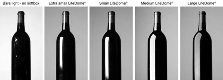 از طرفی هر چی softbox کوچیکتر باشه ، نور کمتری روی سوژه میفته و سایه ها یکم تند تر میشن ! یا مثلا در مورد محصولات شیشه ای ، اندازه سافت باکس میتونه خیلی توی خروجی عکس شما تاثیر بذاره . تصویر زیر چندتا عکس از بطری شیشه ای رو نشون میده که با softbox در اندازه های مختلف گرفته شده .