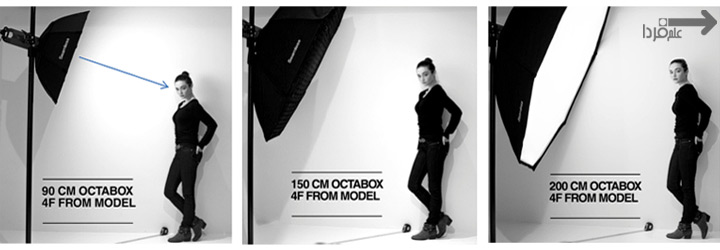 از سمت چپ ، سایز سافت باکس هی بزرگتر شده تا راست . می بینید که هر چی softbox بزرگتر شده ، انعکاس نور کمتر شده ، نور نرم تر شده و بطری شیشه ای طبیعی تر افتاده . ضمن اینکه تو عکس آخر ( راست راستیه ) قسمت انعکاس پایین بطری و بالای بطری به هم نزدیک تر شدن . این مسئله به ببیننده کمک میکنه تا شکل واقعی بطری رو راحت تر حدس بزنه !