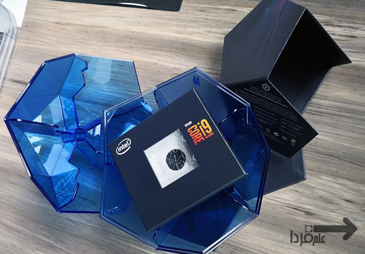 جنس بسته بندی قبلی اینتل کارتن ( کاغذ ) بود اما بسته بندی سی پی یو core i9 اینتل از جنس اکریلیک هستش . یه چیزی شبیه به تلق شیشه ای ! جالبه بدونید که دیگه خبری از فن خنک کننده داخل پکیج پردازنده core i9 نیست این در حالیه که سی پی یو های قبلی اینتل با خودشون فن خنک کننده هم داشتن . البته این مسئله بخاطر اینه که سیستم خنک کننده سی پی یو core i9 کلا فرق داره و بهتره که از خنک کننده آبی ( مایع ) استفاده بشه .