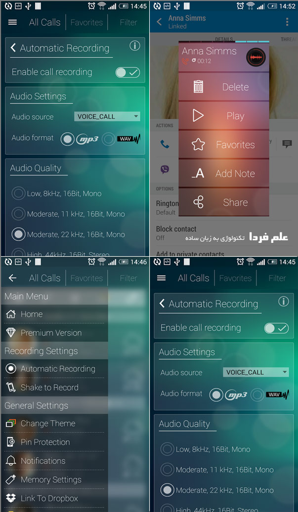 ■ امکان ضبط مکالمه با فرمت MP4 , MP4-HQ , M4A , M4A-HQ , OGG , OGG-HQ , WAV WAV-HQ , FLA , FLA-HQ