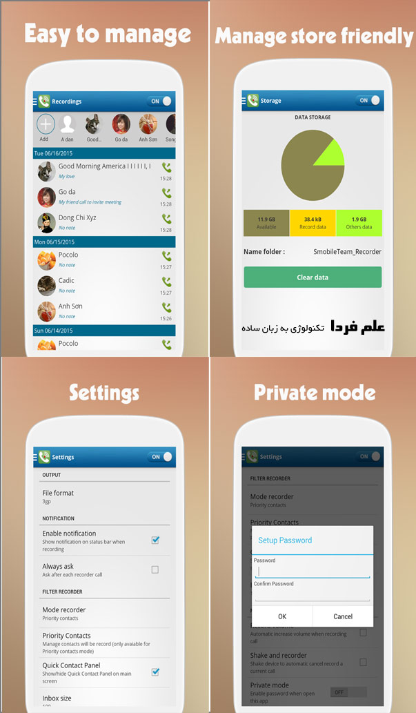 ■ ویژگی Private mode برای جلوگیری از دسترسی دیگران به مکالمات ضبط شده . می تونید برای وردو به برنامه یه رمز عبور بذارید .