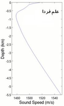 دما با افزایش عمق ، کم می شود اما فشار و شوری آب بیشتر می شود . در نمودار زیر نیز افزایش سرعت صوت در آب دریا را با افزایش عمق آب مشاهده میکنید .
