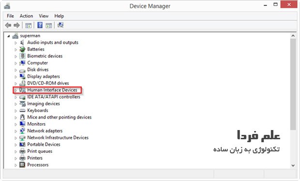 ■ در صفحه Device Manager گزینه Human Interface Devices رو پیدا کنید و روش کلیک کنید .