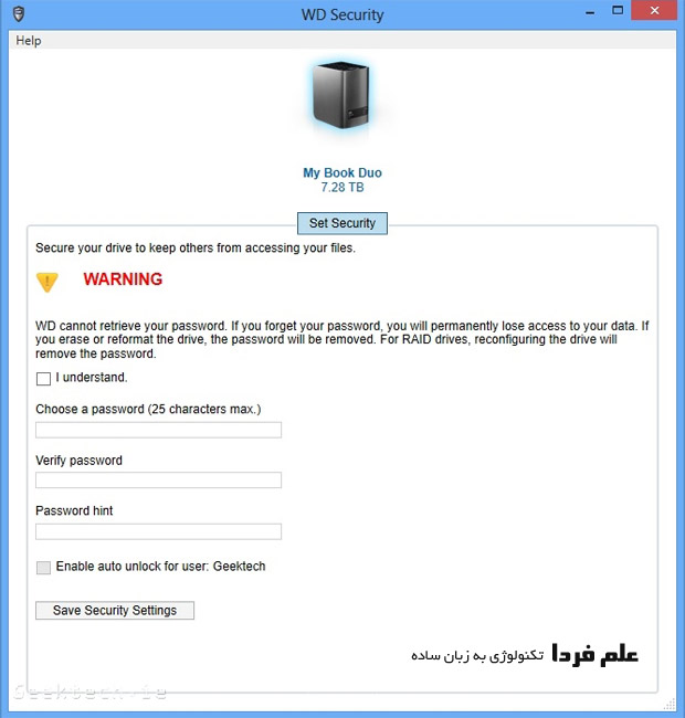 ■ هارد اکسترنال وسترن دیجیتال آلترا قفل سخت افزاری AES داره . AES مخفف Advanced Encryption Standard هست . به زبون ساده با این قفل سخت افزاری می تونید روی فولد و فایل ها به صورت جداگونه رمز بذارید تا هر کسی نتونه فضولی کنه . ضمنا یه نرم افزار WD Security داره که می تونید یه پسورد روی هارد بذارید یعنی برای دسترسی اولیه به هارد باید پسوردتون رو وارد کنید . اینجوری دیگه هیچ مدله هیچ کس نمی تونه به اطلاعات مهم شما دسترسی پیدا کنه . این در حالیه که هارد المنت هیچ کدوم از این مزایا رو نداره .