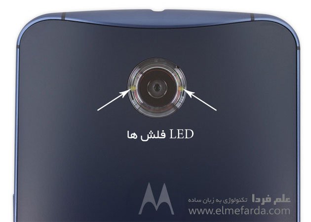 در عکس زیر کاور دور لنز دوربین نکسوس ۶ به همراه دو عدد LED کوچولوی سفید رو می بینید که این دو تا LED در جهت های مختلف نور منتشر می کنن . اون کاور ، کارش هدایت نور فلش هاست .