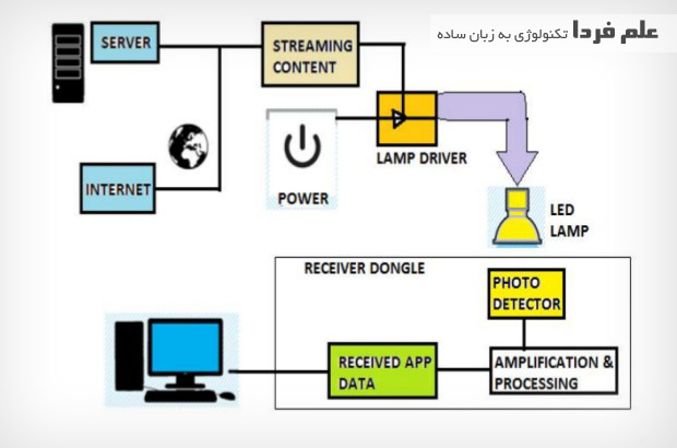 در تکنولوژی لای فای هم تقریبا از یه همچین پروسه ای استفاده میشه . به زبون ساده و جامع بخوام توضیح بدم اینجوری میشه : لامپ های LED مخصوصی طراحی میشن که درایور و تغذیه دارن ( درایو رو مثل یه کنترل کننده در نظر بگیرید ) اطلاعات از اینترنت ، از طریق سیم یا بی سیم به این لامپ ها فرستاده میشن ، این دیتا توسط مدار کنترلی ( درایور ) پردازش و از طریق نور لامپ به یه ماژول گیرنده نوری ارسال میشه . اون ماژول نوری می تونه روی دستگاه نصب باشه یا مثل یه فلش مموری باشه . اگه جدا باشه شبیه به یه فلشی ( دانگل ) میشه که یه سرش گیرنده نوری داره و یه سر دیگش کانکتور ارتباطی با موبایل ، لپ تاپ یا وسایل دیجیتالی دیگه هست . نور دریافتی توسط سنسور نوری ، توسط مدارات داخلی ماژول تقویت و پردازش میشن و به صورت دیتا در میان و شما مثلا می تونید برید توی گوگل یا هر چیز دیگه .
