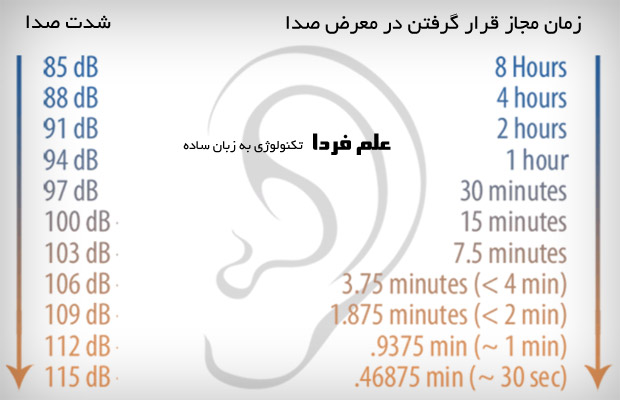 اما مسئله مهم بعدی اینه که هر چی صدا قوی تر باشه مدت زمان کمتری نیازه تا به گوش شما آسیب وارد بشه . مثلا اگه با 8 ساعت کار کردن در صدای 85 دسیبل گوش آسیب می بینه ، برای شدت صدای 115 دسیبل حدود 30 ثانیه کافیه ! شکل زیر رو نگاه کنید :