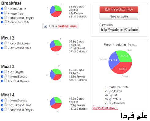 مقدار پروتئین ، کربوهیدرات و چربی هر وعده غذایی جلوی آن به صورت نمودار نمایش داده میشه و سمت راست نیز همین مقادیر برای یک روز کامل .