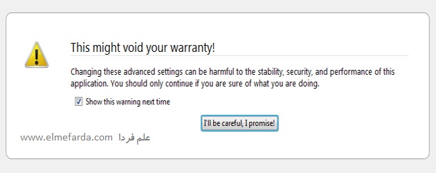 تغییر موتور جستجوی پیش فرض فایرفاکس برای مبتدی ها ممکنه یکم دردسر شه چون روش انجام این کار ( بیشتر برای کاربران ویندوز ) اصلا متعارف نیست ! خوب دیگه بریم سر اصل مطلب ! برای تغییر موتور جستجوی پیش فرض فایرفاکس ابتدا در نوار آدرس عبارت about:config رو تایپ کنید و کلید Enter رو بزنید . بعد از اینکه این کار رو انجا دادید با پیعام زیر مواجه میشین ! روی ددکمه I’ll be careful, I promise کلیک کنید تا به بخش تنظیمات فایرفاکس وارد بشید .