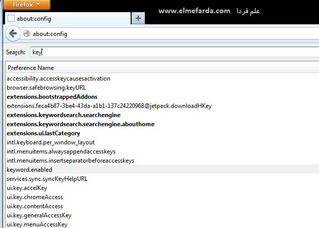 گزینه keyword.url اصلا نبود،وقتی رویkeyword.enabled دابل کلیک می کردم هیچ گزینه باز نمی شد . در روش دوم وقتی keyword search رو نصب کردم تو آپشن هیچی نیومد