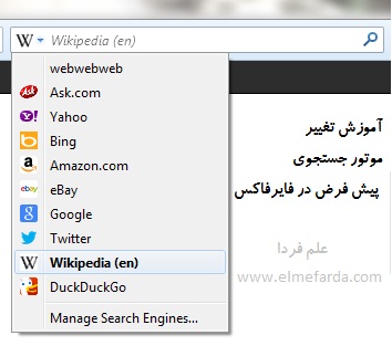 در قسمت بالای صفحه یک باکس جستتجو در سمت راست وجود داره که یک منیوی کشویی ( comobox ) وجود داره که در واقع شامل لیست موتورهای جستجوی مورد نیازتون هست . حالا چرا می گم این ایده ی خوبیه ؟ چون شما همیشه به گوگل احتیاج ندارید ! برای مثا فک کنید که دنبال مقاله ای از ویکیپیدیا هستین در این صورت نیازی نیست 1 بار تو گوگل جستجو کنید بعد دوباره از گوگل وارد ویکیپیدیا بشین !