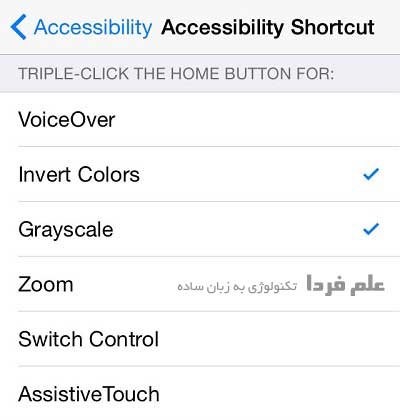 تو قسمت Tripple click the home button for لیست تمام کارهایی که با 3 بار ضربه روی دکمه home آیفون یا آیپد می تونن فعال بشن رو زده . بسته به نیازتون یکی رو انتخاب کنید . مثلا اگه روی Graysclae بزنید ، با 3 بار ضربه روی دکمه home می تونید تصویر رو سیاه و سفید کنید .در مورد سیاه و سفید شدن تصویر قبلا توضیح دادم : ” قابلیت Grayscale در آیفون 6 ” و همچنین ” مقایسه Grayscale در گلکسی اس 6 و آیفون 6 ”