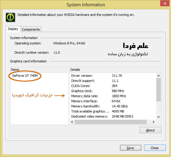 گرافیک اینتل و انودیا رو نصب کردم و با رفتن به nvidia control panel در قسمت system information، مشخصاتی که گفتم رویت شد.