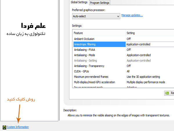 واسه دیدن مشخصات گرافیک انویدیا دو تا راه وجود داره : یکی اینکه بدونید چه گرافیکی دارید یعنی بدونید که مثلا گرافیک انویدیای لپ تاپ شما مثلا مدل ۷۴۰m یا ۸۵۰m هست و بعد توی گوگل یا سایت سازنده مشخصاتش رو چک کنید . راه دوم اینه که بعد از نصب درایور ، راست کلید کنید و وارد کنترل پنل بشید . حالا گزینه system information رو بزنید . شکل زیر :