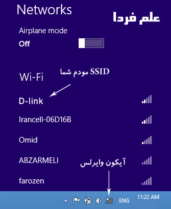 موقعی که درایور وایرلس لپ تاپ نصب باشه و روشنش کنید باید آیکونی مثل شکل زیر ببینید .