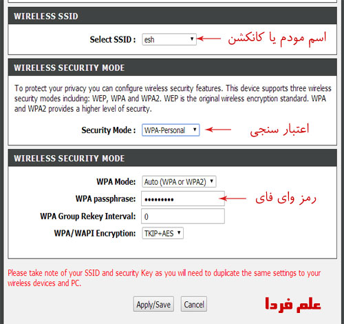 داخل آدرس بار یه مرورگر مثل فایرفاکس یا گوگل کروم عبارت ۱۹۲.۱۶۸.۱.۱ ( شما الان بین این اعداد ، علامت , میبینید اما شما بجاش “نقطه .” بزنید ) رو وارد کنید و Enter بزنید . پنجره ای باز میشه که user pass می خواد اونجا username رو کلمه admin و رمز رو هم admin بزنید ( با حروف کوچیک ) و وارد بشید . هر مودم صفحه تنظیماتش با دیگری فرق میکنه خلاصه یجوری عبارت WLAN یا WiFi یا Wireless رو پیدا کنید و وارد تنظیماتش بشید . ۳ تا گزینه مهمه . گزینه SSID که همون اسم مودم هست که تو لپ تاپ دیده میشه ، یکی گزینه Network Authentications یا روش اعتبار سنجی شبکه هست که می تونید روی Pre Shared Key یا WPA-PSK بگذارید . گزینه بعدی هم Security Key یا همون رمز وای فای هست که یه عبارت ۸ رقمی ترجیحا ترکیبی از عدد و حرف باشه بهتره . حالا گزینه Apply رو بزنید .