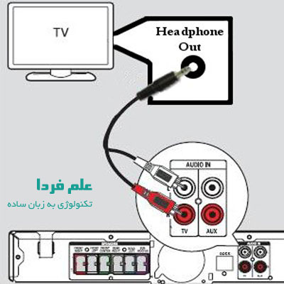 برای این کار سر فیش هدفون رو به جک هدفون تلویزیون و سر دیگه که دو تا فیش RCA هست رو به ورودی صدای سینما خانگی بزنید ( حالا چه به Audio In یا به AUX ) . شکل زیر :