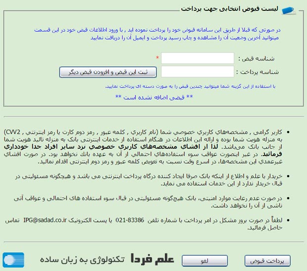 3- در آخر ر وی دکمه پرداخت کلیک کند . فقط فراموش نکنید که بعد از پرداخت قبض حتما شماره رهگیری پرداخت + شناسه قبض و شناسه پرداخت رو یاد داشت کنید . یا اینکه خیلی راحت ازش عکس بگیرید و یه جا ذخیره کنید که اگر احیانا مشکلی پیش اومد بتونید ازش استفاده کنید .
