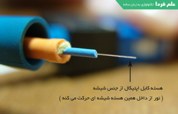 کابل اپتیکال از یه هسته شیشه ای تشکیل شده که نور رو عبور میده . نور توی این هسته شیشه ای نمی تونه فرار کنه و به صورت زاویه ای حرکت می کنه . طرز کار انتقال دیتا از طریق نور خیلی مفصله و اینجا جاش نیست .