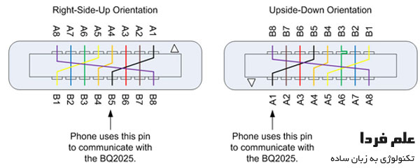 پایه A1 و B5 در تصویر بالا پایه مخصوص شناسایی جهت ورود کانکتور لایتنینگ اپل هست . به محض ورود کابل شارژر آیفون ، پایه B5 چک میشه اگه سیگنال دریافت بشه یعنی کانکتور به سمت بالا و اگه سیگنال دریافت نشه ، پردازنده میره روی پین A1 ، اگه سیگنال بیاد یعنی کانکتور به سمت پایینه . در هر صورت فرقی نمیکنه ، عملیات به درستی انجام میشه .