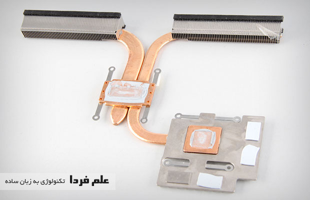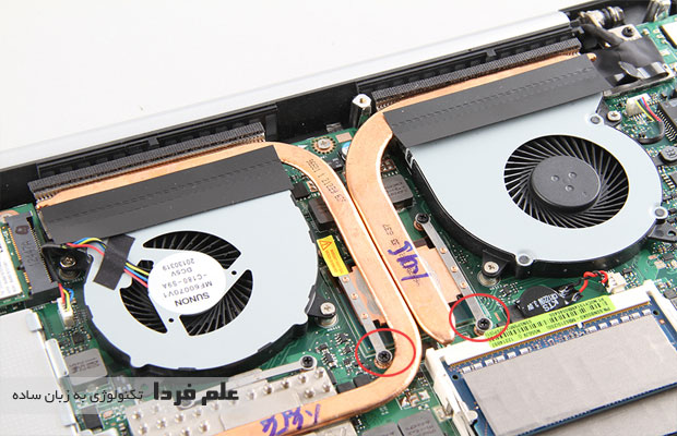 کل سیستم خنک کننده با چند عدد پیچ به مادربورد وصل شدن که اگه اون پیچ ها رو باز کنید به سادگی می تونید CPU و GPU رو ببینید . فن ها جدا و لوله های مسی هم جدا هستن .