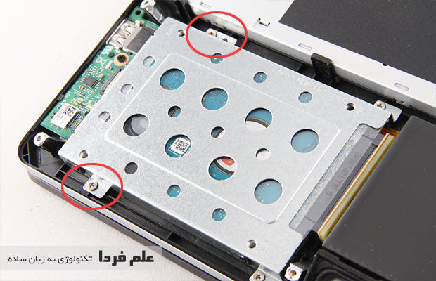 حالا هارد درایو رو باز می کنیم ، هارد توسط ۴ تا پیچ به بدنه لپ تاپ ایسوس N550JK وصل شده . اونارو باز میکنیم