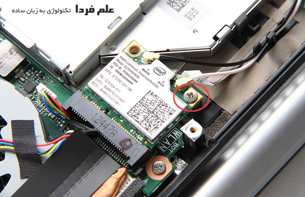 ماژول وای فای رو هم که با یک عدد پیچ به بدنه بسته شده جدا می کنیم . حواستون به اون دو تا سیم باشه که قطع یا معیوب نشن .