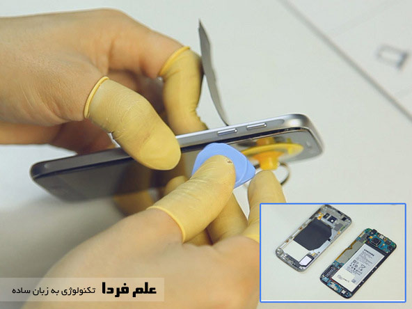 پس واسه باز کردن درب پشت و رسیدن به باتری GALAXY S6 باید بهش گرما بدیم و با ابزاری مخصوص ، شکاف بندازیم .