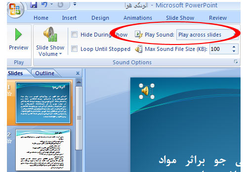 بعد ازاین کار ، این فایل صوتی روی پاورپوینت به صورت تک اسلاید اجرا میشه . برای اینکه موقع رفتن به اسلاید بعدی صدا قطع نشه ادامه رو بخونید .