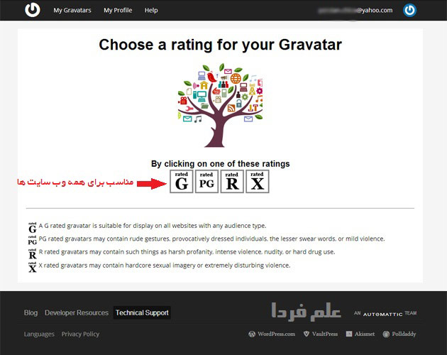 ■ در مرحله بعدی چنتا گزینه نمایش داده میشه که ازتون می پرسه عکسی که به عنوان گراواتار انتخاب کردین برای چه وب سایت هایی مناسبه . اگر می خواید عکس تون در همه سایت ها دیده بشه باید گزینه G رو انتخاب کنید . توجه داشته باشید هر کدوم از گزینه های دیگه رو که انتخاب گراواتار تون در همه سایت ها نمایش داده نمیشه . این آپشن رو برای این گذاشتن که بعضی افراد ممکنه بنا به افکار یا اعتقادات شون عکس های بی ناموسی روی پروفایل شون بذارن … خخخخخ 😀 .