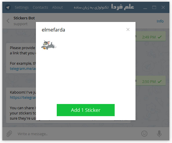 ■ تموم شد ! الان شما یه مجموعه استیکر ساختین که همه می تونن ازش استفاده کنن . برای اضافه کردن استیکر های شخصی کافیه روی استیکر مورد نظر چند ثانیه لمس کنید و بعد روی گزینه Add sticker کلیک کنید .