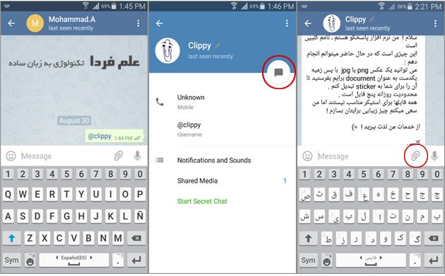 • راه دوم هم اینه که برید به آدرس URL ربات کلیپی https://telegram.me/clippy و از اونجا روی دکمه سبز رنگ Send Message تا برنامه تلگرام اجرا بشه و صفحه چت با ربات کلیپی باز بشه .