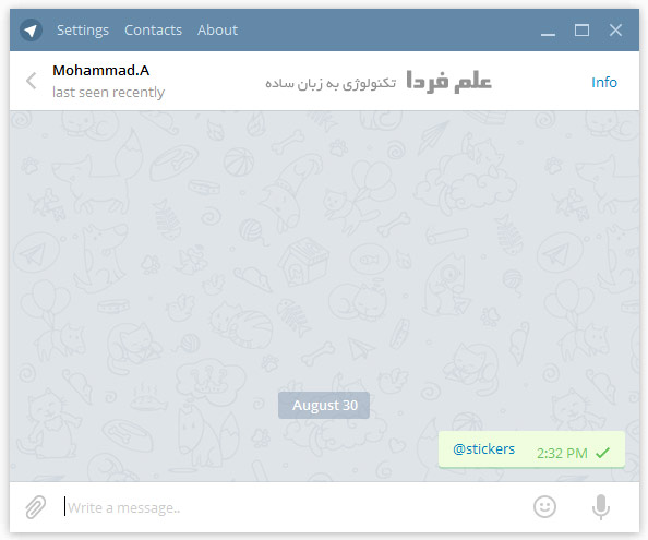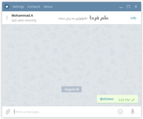 ■ وقتی که enter رو بزنید عبارتی که نوشتین رنگش آبی میشه . روش کلیک کنید تا صفحه چت با ربات Stickers نمایش داده بشه .