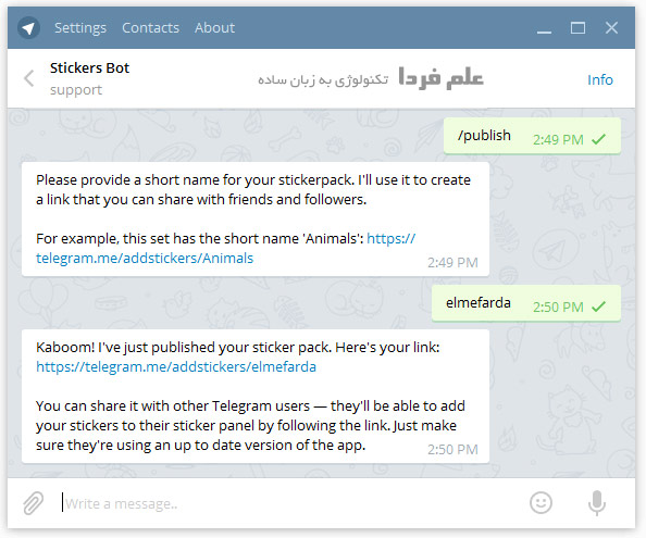 ترجیحا یه نام مرتبط با نام پکیج تون تایپ و ارسال کنید . بعد از ارسال نام پکیج یه آدرس بهتون میده که با کلیک روی اون آدرس می تونید پکیج استیکر مورد نظر رو به تلگرام تون اضافه کنید .