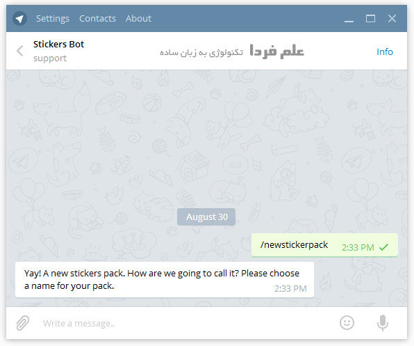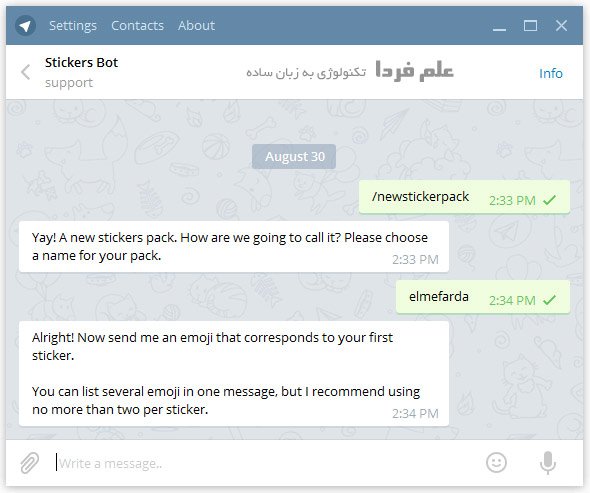 ■ هر استیکر تلگرام باید در یک پکیج ( بسته ) استیکر باشه . برای ساخت پکیج استیکر تلگرام عبارت /newstickerspack رو تایپ کنید .