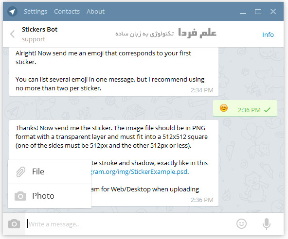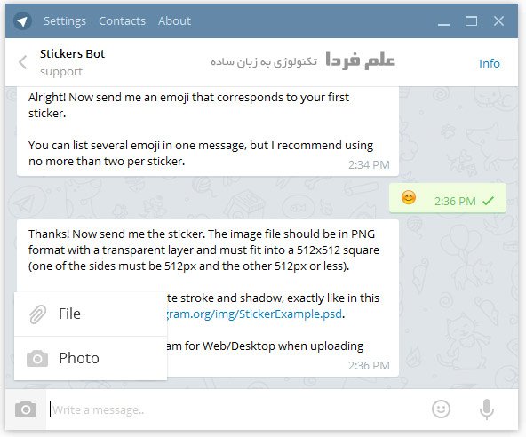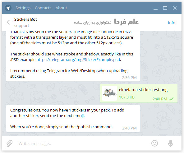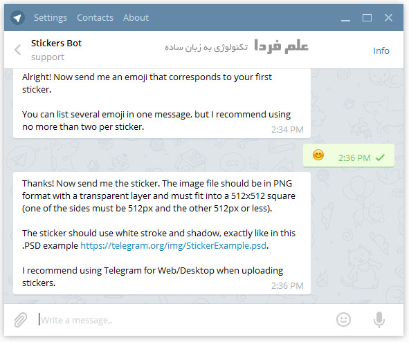 خب از اینجا به بعد دیگه در نسخه دسکتاپ و موبایل مثه همه و فرقی با هم ندارن . در ادامه باید چنتادستور به ربات Stickers ارسال کنید . لازمه یادآوری کنم خدمت تون که دستوراتی که برای ربات های تلگرام ارسال می کنید با کرکتر / شروع میشن و کل دستور باید بدون فاصله تایپ و ارسال بشه .