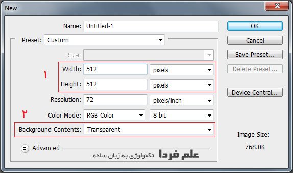 ساخت استیکر تلگرام با استفاده از برنامه فوتوشاپ کار بسیار ساده ایه . همونطور که خدمت تون عرض کردم استیکر تلگرام در واقع یک عکس 512 در 512 پیکسل با فرمت png هست که خب اگر یکم با فوتوشاپ آشنا باشید خیلی راحت می تونید بسازیدش . اول از همه باید عکس مورد نظر تون رو بیارید تو محیط فوتوشاپ . بعد برید تو منیوی File و روی گزینه New کلیک کنید . در پنجره New گزینه های Width و Height رو روی 512 و Pixel تنظیم کنید . و بعد روی دکمه OK کلیک کنید .