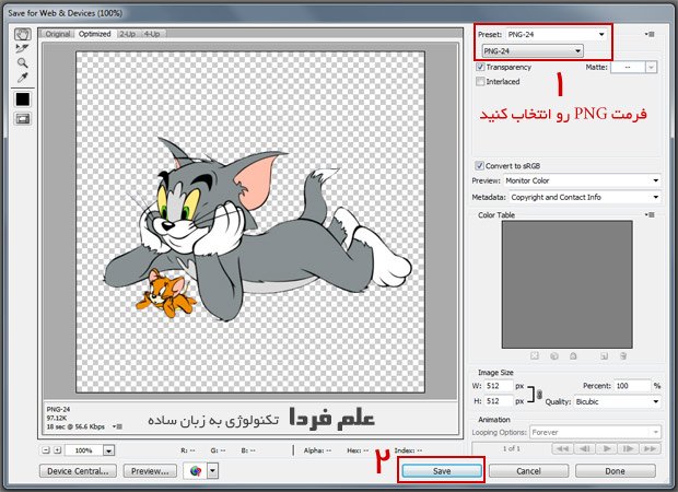 خب حالا بعد از اعمال تغییرات روی عکس مورد نظر ، برید تو منیوی File روی گزینه Save for web and devices کلیک کنید . در پنحره ای که باز شده در قسمت بالا اون گزینه jpg رو به png-8 یا png-12 تغییر بدین و زیر همین گزینه Transparent رو تیک بزنید و بعد روی دکمه Save کلیک کنید و عکس تون رو ذخیره کنید .