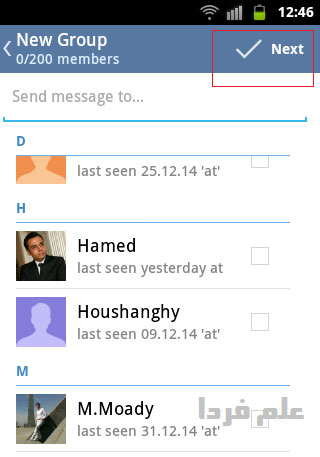 ■ حالا هر کدوم از افرادی که دوس دارین در این گروه باشن و رو تیک بزنید تا به لیست اعضای گروه تون اضافه بشن . اگه وقت ندارید می تونید بقیه شون رو بعدا اضافه کنید . بعد از اینکه مخاطب های مورد نظر رو تیک زدین از منیوی بالا روی گزینه Next کلیک کنید .