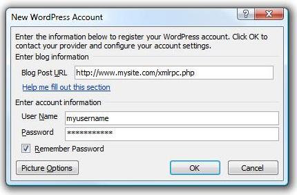 در این قسمت از شما آدرس اینترنتی وبلاگتان را می خواهد که در قسمت مربوطه وارد کنید . سپس نام کاربری ( Username ) و رمز عبورتان ( Password ) که در WordPress ثبت نام کردید را وارد کنید تا به اکانت بلاگ خود در ورد دسترسی پیدا کنید .