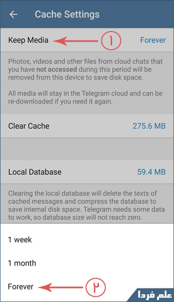 تنظیمات مربوط به مدت زمان نگهداری کش تلگرام – نسخه اندروید